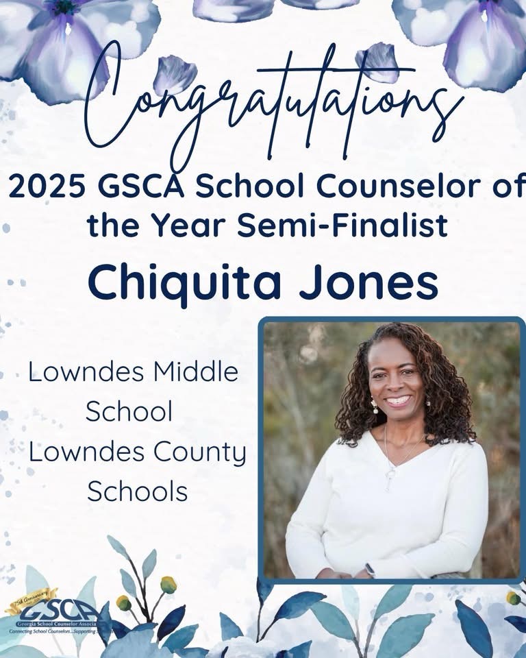 Congratulations to our very own branch member, Chiquita Jones, for being recognized as a 2025 GSCA School Counselor of the Year Semi-Finalist. Jones is a school counselor for Lowndes Middle School. When sharing the good news, Jones stated, “I don’t normally toot my own horn, but I’m pretty proud of the things I’ve done to help my students and community. It is an honor to be recognized.” We are so very proud of her accomplishment.