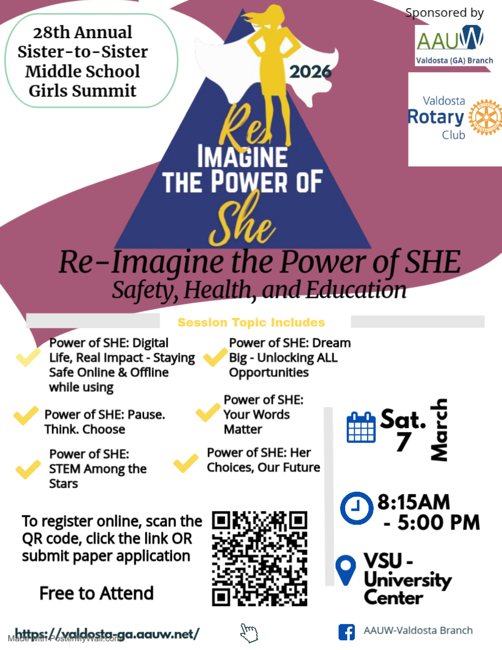 Registration is officially open for the 28th Annual Sister-to-Sister Summit sponsored by Valdosta-AAUW and Valdosta Rotary Club. This year’s summit, “Re-Imagine the Power of SHE: Safety, Health, and Education,” will take place on March 7, 2026 at Valdosta State University – University Center. This free event includes activities and interactive workshops designed to help middle school girls feel motivated and self-empowered in their lives and goals.