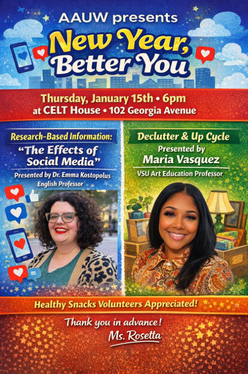 Join us January 15th, 2026, at 6pm for an engaging presentation on “The Effects of Social Media” and “Declutter & Up Cycle”! We look forward to seeing you there.